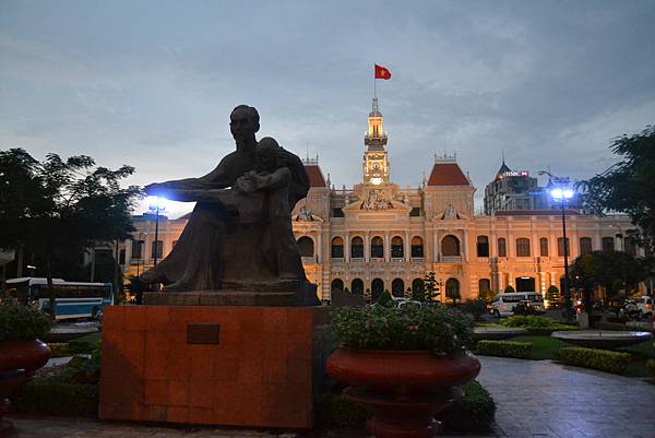 非常法國味道的市政府前面有一個小公園,矗立著胡志明的雕像,懷中抱一孩童象徵胡志明的親民形象。