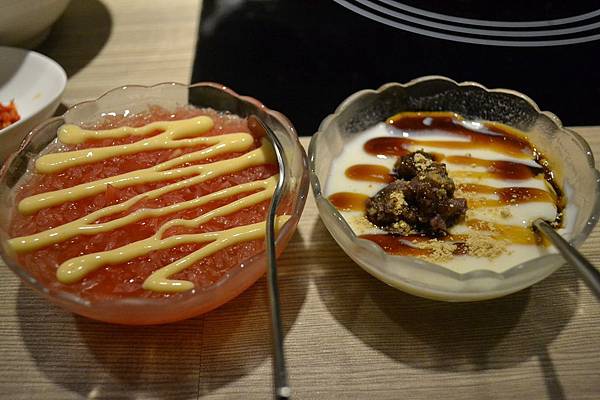 肉吃飽了湯也喝足了,該上甜點啦!左邊是葡萄柚果凍、右邊是黑糖豆奶酪。用一點點甜味來結束鹹鮮的感覺。小編個人喜歡葡萄柚天然的酸不溜丟XD