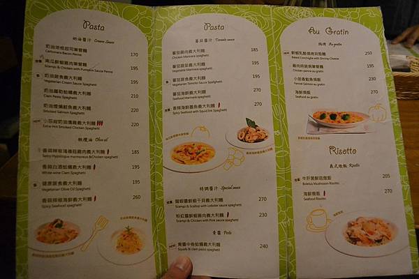 有奶油醬汁、橄欖油、番茄醬汁、特調醬汁還有焗烤的義大利麵,另外還有燉飯。