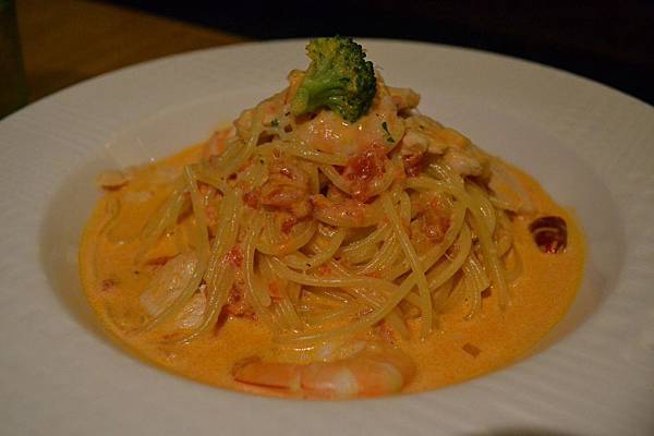 建建和雅文點一樣的 粉紅醬鮮蝦雞肉義大利麵 (230元),稍微上網查了一下,所謂的粉紅醬就是紅醬(番茄)與白醬(奶油)的混搭,不過小編總有種錯覺應該還放了南瓜在裡面!?