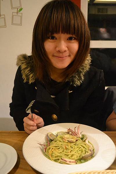 然後是豆芽菜的 青醬中卷蛤蠣義大利麵 (240元),螺絲瑪莉的青醬吃起來竟然有清爽不膩的感覺~