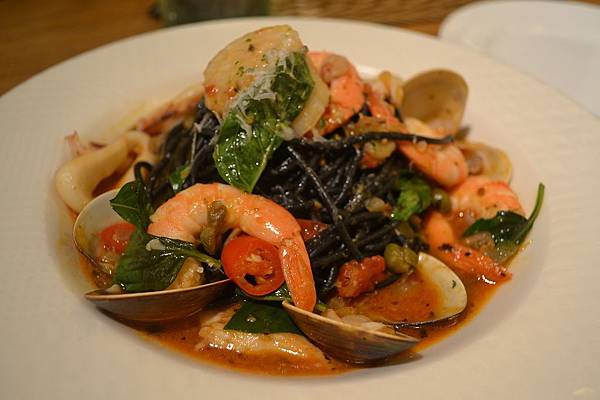 最後是哆啦小編的 香辣海鮮墨魚義大利麵 (270元),微辣,應該是不太吃辣的人可以接受的辣度~ 不過墨魚麵搭的是番茄醬,好吧跟想像中吃得一嘴黑黑不太一樣XD 但還是不錯~看那滿滿的蝦與蛤蠣,還有放在山頭上的干貝。