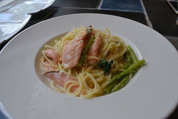 1. 奶油蘆筍鮭魚麵 250元 整道麵的奶油味厚重,鮭魚也是採用偏鹹的燻鮭魚,量給得蠻多的唷,不過小編的同學說,蘆筍的部分就表現普普~
