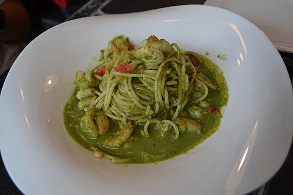2. 青醬奶油蝦仁麵 (260元) 青醬的盤子看起來頗動感XD 因為小編偷吃了一口~發現Opposite的青醬在入口的最後沒有厚重的油味,反而顯得清香,很不賴。義大利麵上桌的速度比披薩快很多,趕時間的旅客(?)可以考慮看看。