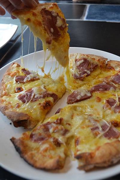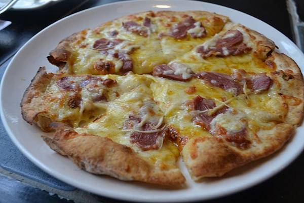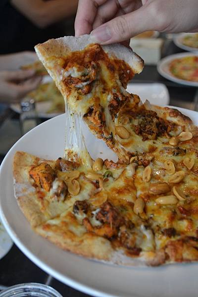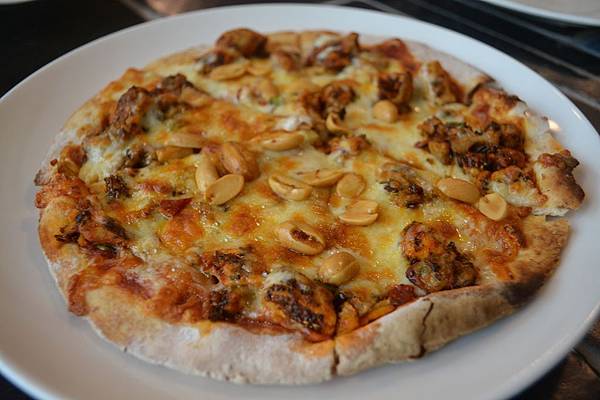 3. 羅馬雞丁披薩 (200元) 這道偏辣的披薩裡麵,有小塊的雞胸肉、四季豆、花生、起司和紅醬。紅醬的味道相對不太明顯,辣味和雞肉的烤香很足夠~