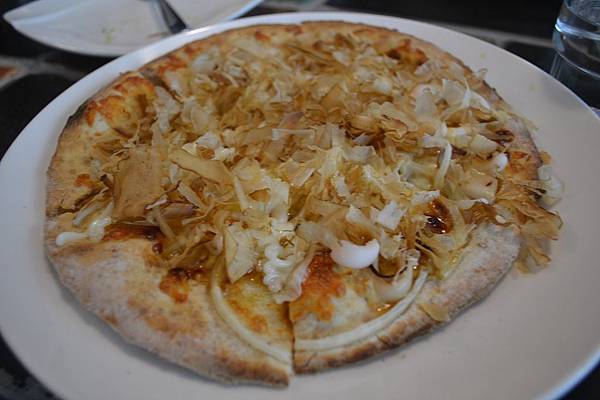 4. 大阪花枝披薩 (240元) 有花枝、洋蔥、美乃滋、起司,舖上了滿滿的柴魚片,底下的照燒醬甜甜鹹鹹,有濃濃的日本味道。