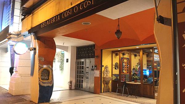 和上回介紹過的新加坡牛車水餐廳頗近,各國料理大多都吃得到,也是生活在臺北城重要的樂趣之一。這天吃到的Cosi O Cosi闊喜窩義式冰淇淋,也是從忠孝敦化站7號出口出來直走,遇到大馬路(敦化南路)過馬路後右轉,再直走。右手邊看到波浪型的柱子就是啦!這個誇張的柱式和色彩鮮艷的裝潢風格,似乎讓人想起巴塞隆納(?)