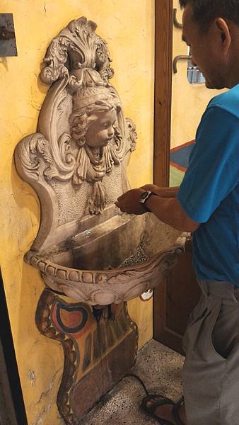 吃完冰啦!心滿意足地到門外洗手。特別的洗手槽,需要踩踏板才能讓小孩噴水XDD