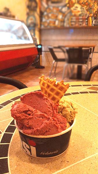 綜合莓果有著非常過癮的冰涼酸甜,與其說是甜,不如酸還多一些,味道頗自然,隨著紮實的Gelato口感一步步襲來>< 開心果是今天的Speciale,據說是採用義大利西西里島特產的綠皮開心果,成本比隔壁棚的水果高很多喔!果仁的味道也是滿滿地在冰淇淋中了,越吃越香~