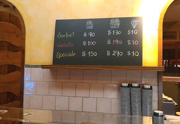 菜單,冷凍櫃裏頭的冰淇淋就區分成Sorbet、Gelato和Speciale三種,依次有不同的價錢,多一球還折10元。Sorbet比Gelato的熱量更低,因為製作過程不含奶類,自然也沒有什麼乳脂肪,主要還是吃各種食材的原味。