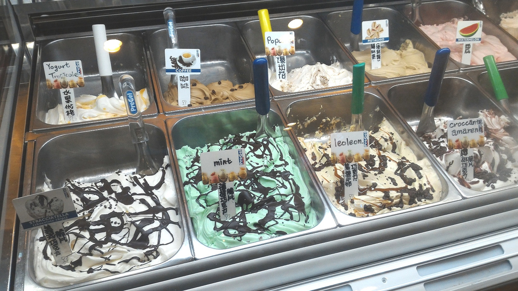 講這麼多冰淇淋的故事,不如直接來看看本尊吧!下圖除了開心果口味是屬於Speciale之外,其餘都是Gelato。牌牌上的PreGel顯示這裡的冰淇淋出自義大利第一品牌唷!