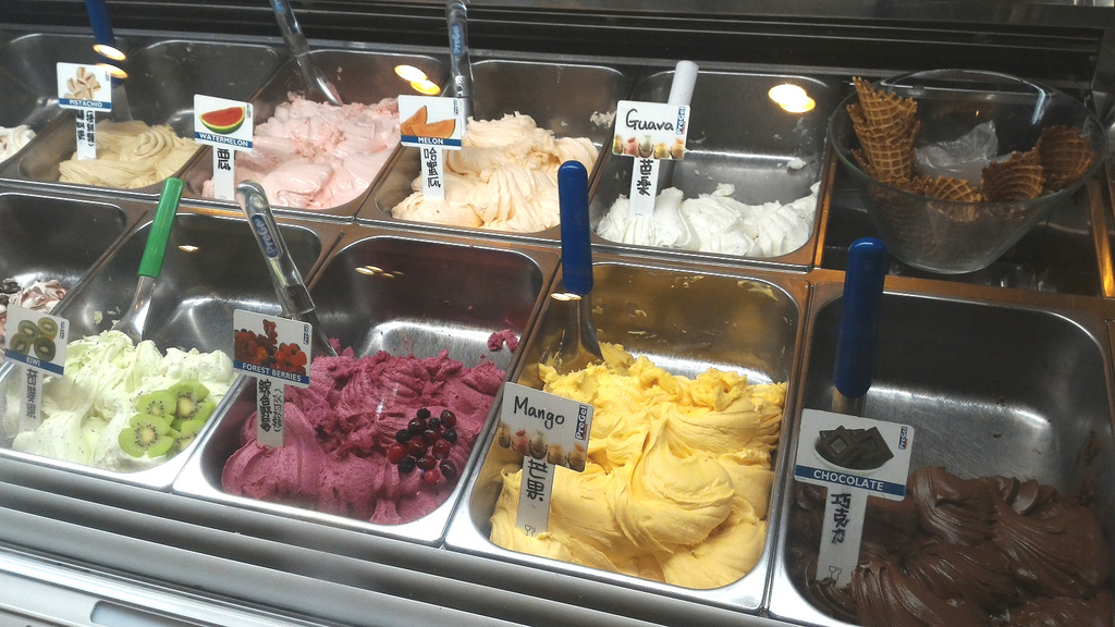 下圖的水果類都是Sorbet。老闆娘熱情招待小編試吃了芭樂和芒果(試吃大概是冰淇淋店優良的傳統XD 讓你不大有機會踩到雷~),全部都好芭樂、好芒果,感覺就像是在吃真的芭樂和芒果Orz