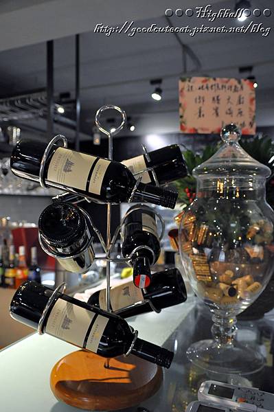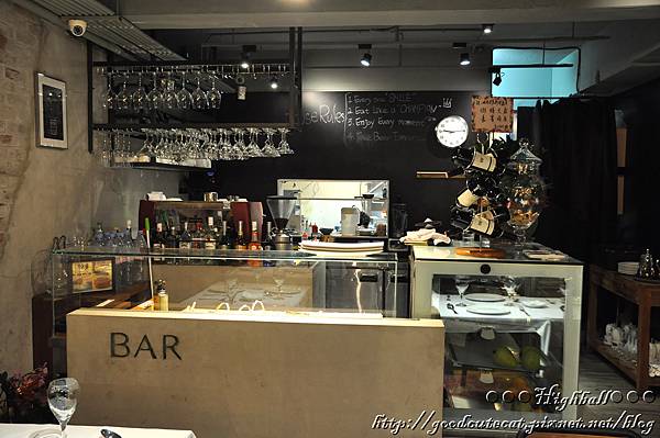 R&R的櫃台,以透明櫥窗、倒掛著的高腳杯,還有右手邊在架上交錯排列的紅酒瓶,營造一種酒吧的感覺,又更加使人感到放鬆舒適了。