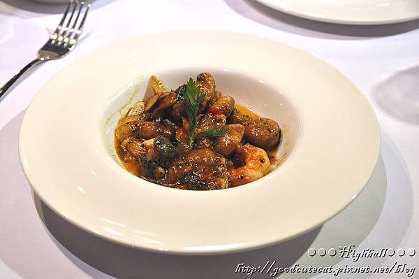 蘑菇以辣椒、蒜片、九層塔與胡椒拌炒,還有脆彈的鮮蝦陪襯。剛端上來就是辛香料撲鼻的香氣,吃著吃著,可以感覺胡椒餘韻還在口中,是那略有後勁的辣。Richard表示,因為炒蘑菇口味偏重,廚師會根據顧客點的主菜,來調整這道開胃菜的濃淡。