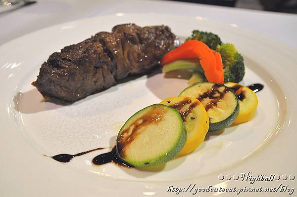 Richard對自己的牛肉很驕傲,食材進口商和大直的「牛排教父」相同(牛排教父的D&C Bistro食記請點此),在零度不結冰的狀態下新鮮運送。但R&R的牛排,對比D&C Bistro的Prime級肋眼一客就要1,780元 + 10%,在開胃菜、湯品、甜點表現難分軒輊的狀態下,價格可說是相當實惠。(關於各種牛排區別的詳盡介紹,來看TNT牛排館的食記請點此) 另外,配菜的黃綠櫛瓜搭配酒醋,像是讓味覺重新整理,更深刻地去感受牛肉的香氣和柔軟。