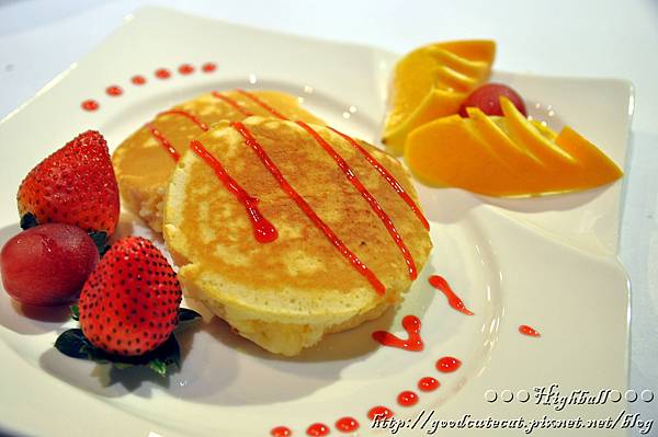 R&R的擺盤真的不錯,光是看就食指大動。兩塊鬆餅,果醬用得不多,周圍有水果可以搭配。