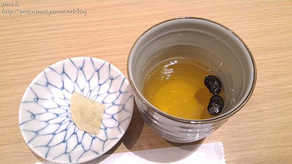 服務人員會為客人斟茶,喝完了可自行從座位前方找到茶壺取用。配菜的醃蘿蔔、醃漬薑片也是在餐桌上提供自取。醃蘿蔔清涼甘甜,相信是為了滿滿的炸物去油膩之用。