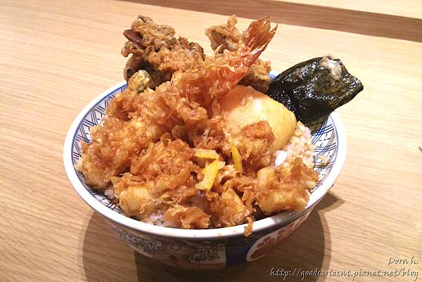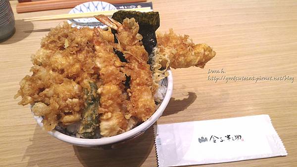 不過本著好奇心,小編還是點了江戶前天丼XD 份量如圖所見,非常驚人!根本看不到米飯在哪裡...以這樣的價錢吃到如此豐富的天婦羅種類,也難怪眾多食記都說金子的C/P值高了。