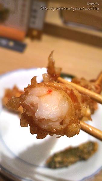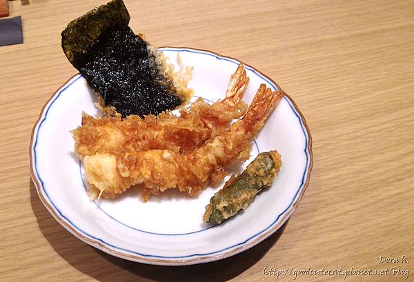 讓我們把炸蝦、青龍(炸青椒)、炸海苔片取出來擺在盤子上...不然吃不到底下的飯XD 炸蝦的份量固然比不上穴子魚,但也夠滿足啦~