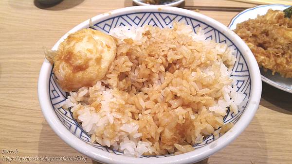 將上頭的天婦羅全數取出盛盤,就發現底下滿滿的白飯。據說金子半之助選用最接近日本米口感的台梗九號,並且淋上創辦人金子半之助先生調製的「秘傳醬汁」,有點像台式傳統的醬油拌飯,鹹香有味。對小編個人來說還是稍鹹了一些...據說丼碗還是特製的,內碗底和外碗底間有中空設計,雖然減少了容量(小編覺得飯還是很多...),但可將熱氣保存在碗裡。