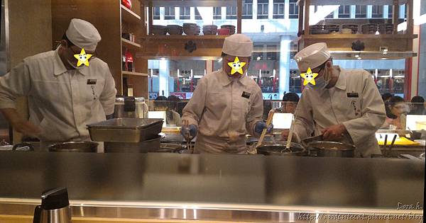 臨長桌而坐,看著玻璃窗裡頭的師傅們努力地將天丼組裝,澆上醬汁,再呈現給大排長龍嗷嗷待哺的賓客們XD