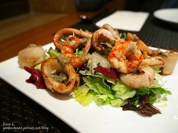 炙烤的香氣撲鼻而來,計算了一下,有兩只蝦、兩只干貝和數個墨魚圈。蝦尤其特別,處理得外酥內綿,口感不錯。海鮮底部是蘸了油醋醬的沙拉,搭配剁碎的洋蔥和細微的胡椒顆粒,咀嚼著,會有地中海般的酸味殘留在嘴裡。吃得到少許碎魚肉,和一點點鮮味,是隱藏在最後端才跳將出來的,魚子醬。