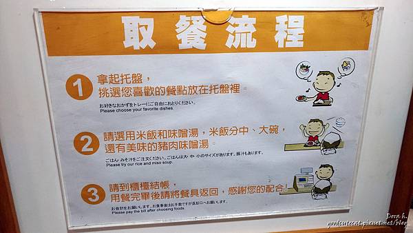 當天抵達的時候八點出頭,已經過了用餐的尖峰時間,不過仍有些許排隊人潮,等了約莫15分鐘後進場。取餐流程告示貼在進門的左手邊,其實不是很明顯,服務人員也未提醒,不過也許跟迴轉壽司店一樣,大概預設會來用餐的客人都已經知道規則了吧XD 在這個告示的旁邊,有兩座大釜,另一頭還有著關山米的米袋,暗示著雖然是食堂,但做起釜飯來也不馬虎。