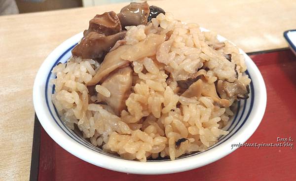 米粒不因炊煮而變得糊軟,吃得到醬油香、菇香,無論單吃還是搭配其他菜色都很不錯!自己在家裡也試過,菇類無論是用醬油先醃過或炒過可降低生味,再和米、水、調味料 (醬油、味霖、鹽等)一起燉煮,蓋上鍋蓋,沸騰後轉小火煮10分鐘,再關火悶10分鐘,應該可以重現99%炊飯的感覺XD