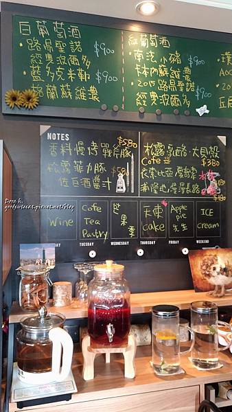 黑板上是除了正式 menu 之外的當日特選菜單,例如單價更高的戰斧豚 (豬肉) 及看起來很不錯的松露乳酪大貝殼麵。在小法國,倒水要自己來,不過相應地免除了服務費,也多了一些自由選擇的空間。檸檬水外,另有常溫的花茶、加熱的麥茶 (不太確定) 可供選擇。