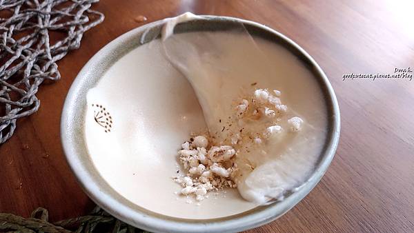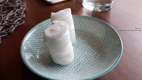 點完菜後,服務人員端上這兩顆白色圓錠形狀的東西,鄉巴佬如我還以為是什麼吃料理前拿來清口的薄荷糖。
