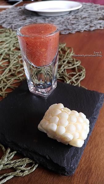 不在菜單上的小開胃菜,憑印象寫的,記得是蕃茄醋飲 (有錯請指正)。比較特別的是服務人員特別強調,甜度高達16的水果玉米。是生吃的,清爽,也果真甜得令人印象深刻。上網一查,甜度16差不多是芒果的境界@@