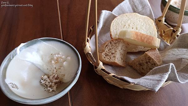 爆米香搭乳酪,既歐式又有台味,cream cheese口感的綿滑乳酪搭麵包自不在話下。麵包可以續點,拿來配之後的例湯和主菜的醬汁也頗誘人。