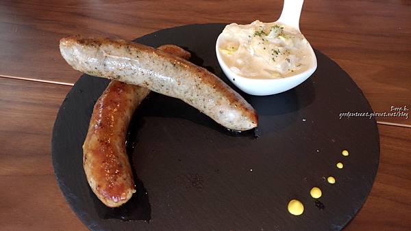 豬腸衣包裹揉合香草及海鹽的豬絞肉,以隨著咀嚼越來有味的方式慢慢滲透。一旁的配菜是法式燉白菜,僅是這一小碗,就用上了蒜頭、奶油、白酒、洋蔥與小農牛奶,奶味香濃。