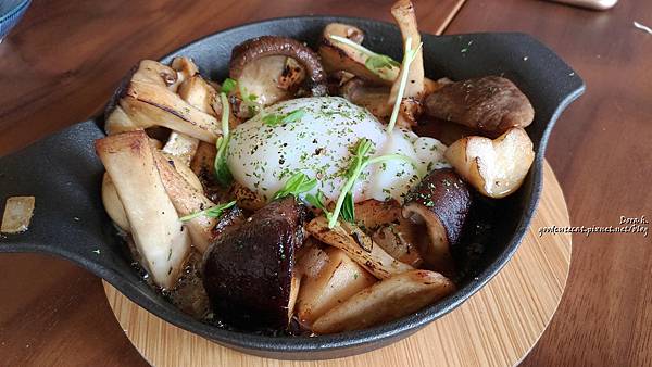 三種菇類,跟著鐵鍋一起上來把熱氣和香氣都封住。劃破中央的半熟蛋,汩汩流出的蛋液再被鐵板燙過變性,形成熱軟又黏呼呼的口感,與炒菇交融。