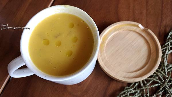 挪開木紋杯蓋,馬克杯裡是本日南瓜濃湯。