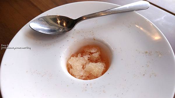 主菜呈上前清口用的,有見過番茄冰沙、果醋,清爽可口的紅心芭樂倒是第一次得見。週邊應該是灑了梅粉,更有吃芭樂的感覺了XD