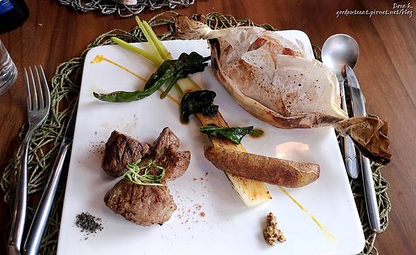 服務人員推薦的佐餐酒,原產法國南部,有著深沉的紅寶石色與莓果香氣,不懂品酒,但至少它是入口不澀的><