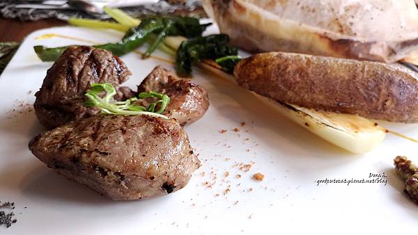 也有不同的風味鹽提供使用,牛排料理前提早抹鹽是為了醃製,料理後上桌抹鹽有人說是為了帶出牛肉的甜味;小法國提供五種花樣的調味鹽,從右下角開始順時針依序是煙燻鹽、三烤竹鹽、檸檬鹽、鹽之花與最常見的玫瑰鹽。上網查了資料,沒看過的竹鹽在本草綱目有「藥鹽」之稱,拿海鹽灌入桂竹筒中,以黃土封口再燒烤多次。烤越多次鹹味會越淡,越能做藥材;三烤則是剛剛好可以拿來料理的次數。
