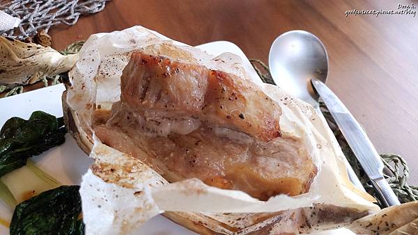算是今天吃的主菜裡面份量最多的,吃完覺得很飽... 一邊是紙包香料烘烤,並捲成糖果形狀;一邊嫩煎出烙痕的豬排。