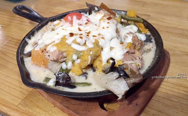 試試看菜單裡相對高價的一區,對於蔬菜和雞腿肉會放到滿出來我已經不意外了,倒是覆蓋其上的莫札瑞拉起司,包裹食材,像是起司條內餡的那種軟韌、乳酪香,令人滿足。另外,每日的蔬菜會作調整,像今天就多了四季豆、茄子。