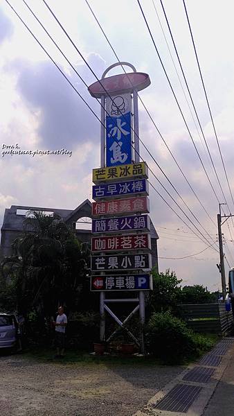 國道3號轉台84線南下,過走馬瀨隧道後不久,就可以看到大大的「冰島」招牌了。這張逆光拍的,有些不清楚。冰島除了玉井最出名的芒果冰,另有販售鹹食,如麵類、簡餐、火鍋等,相當多元。像我們隔壁的就在吃乾麵。