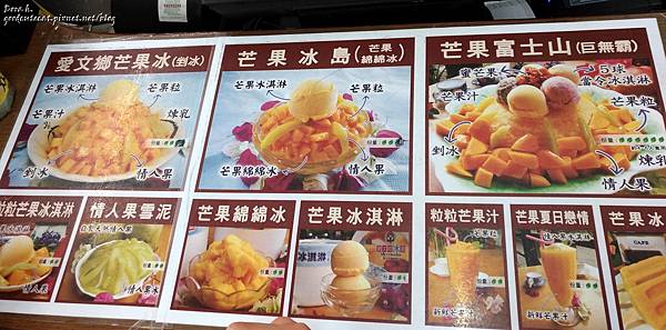 點餐櫃檯,針對芒果系列產品有明確清楚的圖示XD 上面三款是冰島的芒果冰,左一的本體是清剉冰,可能因為成本較低廉的關係,有加煉乳添味,也比較大碗;中間是冰島,本體是以鮮榨芒果汁製作的芒果綿綿冰,幾似雪花冰的口感;最右邊則是4-5人份的巨無霸芒果冰,除了一樣的芒果粒、情人果之外,還加上其他口味的冰淇淋。