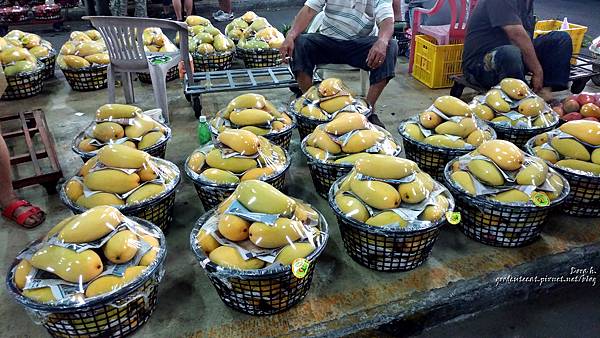 現場一看,怎麼都這麼大籃XDD 只怪自己沒做好功課,看了有點錯愕,連續問了幾攤,尤其是比較裡面的幾攤,似乎都是自產自銷,要買就一次買整籃,不能零買。家裡人口少,這個芒果量,大概擺到壞掉也吃不完XD