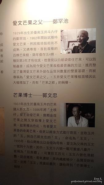 後來的故事大家都知道了,愛文成功培植,鄭罕池先生發明以白紙袋套住芒果,保護芒果免於蟲害的方法,愛文產量大增,外銷到世界各地。這裡也介紹了以金煌、愛文嫁接出「玉文芒果」的郭文忠先生,讓人對玉井的芒果產業發展史有大致的了解。
