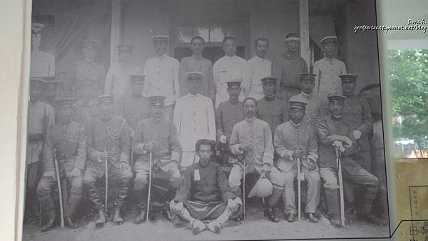 日軍逮捕余清芳(第一排中央坐地者),與之合影。余腳上尚有腳鐐,右肩貼著名條,依《匪徒刑罰令》判死。
