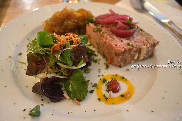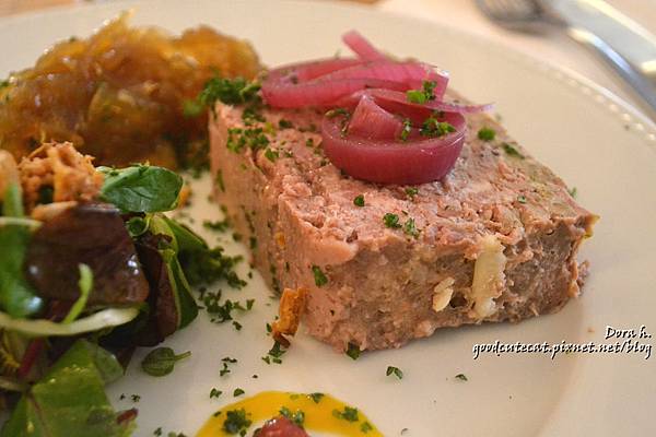 回頭看看這個鴨肝冷派,如果沒吃錯,應該還加了鴨的碎肉絲在裡頭,使綿軟的鴨肝多了一分嚼感。口味調得略鹹,不過也有蜜漬、酒漬的洋蔥幫忙解膩,鹹甜均衡。