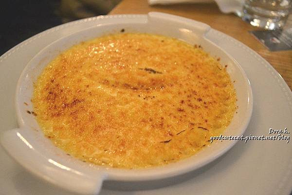 看來看去,這間餐酒館的甜點對我來說似乎沒有什麼一定要試試否則會後悔的。老婆對甜點有偏好,所以點了Crème brûlée烤布蕾。烤布蕾與烤布丁不同之處,在於用鮮奶油取代了牛奶。焦糖很香,但要我說的話,其實跟在臺灣吃過的布蕾沒有太大的差別,倒是鮮奶油那種人造感的香味少了一點XD Fève de tonka是通卡豆、lait entier是全脂(牛奶)、recette是食譜,ancienne則是古老的,整句翻成中文可能是老奶奶食譜烤布蕾 之類的吧XD