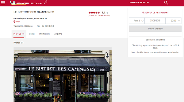 Campagnes的裝潢隨興又不失整齊,很令人舒服的風格。其實無論有沒有遵循上述的原則,找間像樣的餐酒館並不是那麼難的事。在這個網路發達的年代,早就有Trip Advisor、Google評論甚至先行的部落客幫忙拍照寫了食記,另外,身為美食一級戰區的巴黎,有一個眾所周知的米其林指南。米其林指南除了評高檔的一星、二星、三星之外,也提供一個找餐廳的平台。例如我就是從Google map連進Campagnes在米其林平台的頁面。這個頁面除了簡短的介紹,另附有訂位的功能。原文以法文書寫,看不懂也不打緊,可以用Google chrome的翻譯功能翻譯成英文。以下截圖自米其林平台官方網站。