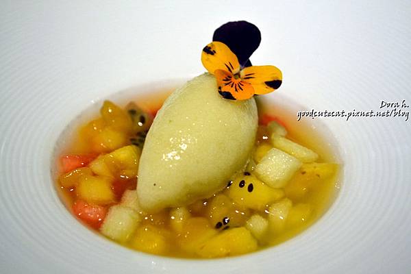 七菜的套餐在一湯、雙前菜、雙主菜之後,要進入雙甜點作為收尾啦!首先是鳳梨冰淇淋佐水果湯。這裡的用字也有趣,Minestrone其實是義式蔬菜湯,一個用大湯勺挖的鳳梨冰淇淋,就躺在醃漬綜合水果丁的甜湯裡。上頭再用花瓣點綴,春意盎然。雖然燈光略暗,但有著點亮心情的作用XD