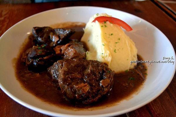 其實店員介紹的時候不會像米其林餐廳那樣把每樣食材、做法鉅細靡遺地娓娓道出。只是簡短地說,這道是牛、這道是兔子、這道是豬腳或香腸云云;因為曾經在料理教室上過比利時黑啤酒燉牛肉,就想來嚐嚐與原版的有何不同。